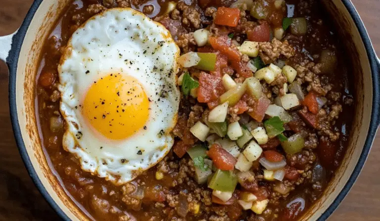 Breakfast Chili and Eggs is a dish that combines the best elements of comfort food and breakfast. With savory turkey sausage, crispy bacon, smoky fire-roasted tomatoes, and a blend of spices, this hearty chili is perfect for warming you up during the colder months. Whether you serve it over hash browns, pair it with fried eggs, or top it with your favorite fixings, this dish is versatile enough to suit any taste. It’s a satisfying meal that brings together flavors and textures in a way that feels both comforting and exciting. Try it for breakfast, brunch, or even dinner, and experience the deliciously cozy joy of Breakfast Chili and Eggs.