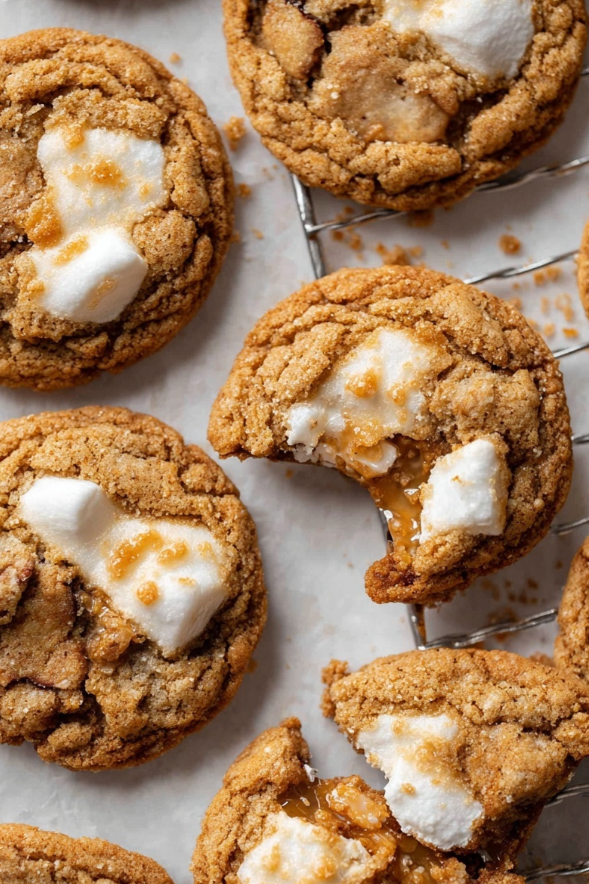 Cookies that involve marshmallows demand attention in the oven. Bake your dough balls at 350°F and keep a close eye starting at minute 9. Marshmallows can quickly go from perfectly golden to burnt. You want edges set but centers still slightly underdone—they’ll finish baking on the sheet. Aim for 10–12 minutes, depending on size. Let them rest on the pan for at least 5 minutes before moving. That gooey center will set up just enough for the perfect bite. If you’ve baked Gingerbread Cookies before, you know just how important those last few minutes are.