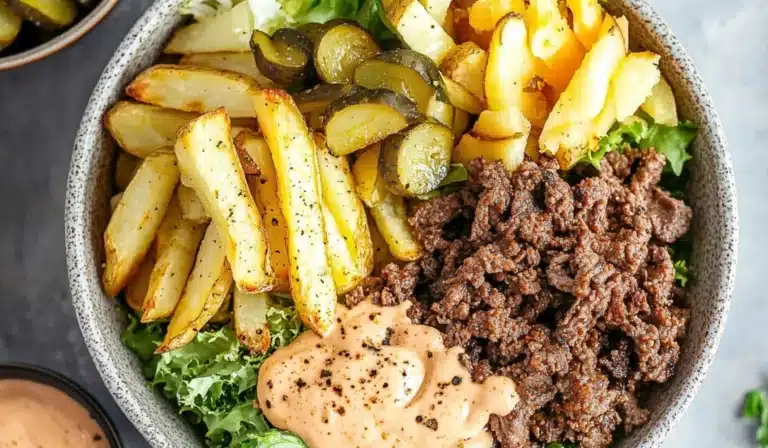 This Burger Bowl recipe is tailor-made for beginner cooks because it breaks down the cooking process into easy-to-follow, manageable steps, focusing on foundational techniques that are easy to master and will serve you well in countless other recipes. We’re essentially seasoning potatoes and cooking them to crispy perfection (either in the oven or air fryer), browning lean beef mince with a simple spice mix (a fundamental skill that unlocks a world of culinary possibilities), and then assembling the bowls with our favorite toppings and a homemade burger sauce (a technique that creates a cohesive and delicious meal). It’s a time-efficient meal, especially if you use an air fryer for the potatoes, making it perfect for busy weeknights, casual gatherings, or any occasion when you need a quick and healthy meal without sacrificing flavor. And while it might seem like an indulgent treat, this recipe can be a reasonably balanced and nutritious meal. Lean beef mince provides protein, essential for building and repairing tissues. Lettuce adds dietary fiber, vitamins, and minerals, contributing to overall health and well-being. You can also adjust the amount of potato chips and sauce to make it slightly healthier, catering to your personal preferences and dietary needs. This Burger Bowl recipe is a fantastic way to learn some basic cooking skills, experiment with flavor combinations, and create a truly flavorful and satisfying dish that will become a new weeknight staple and a go-to recipe in your culinary repertoire.