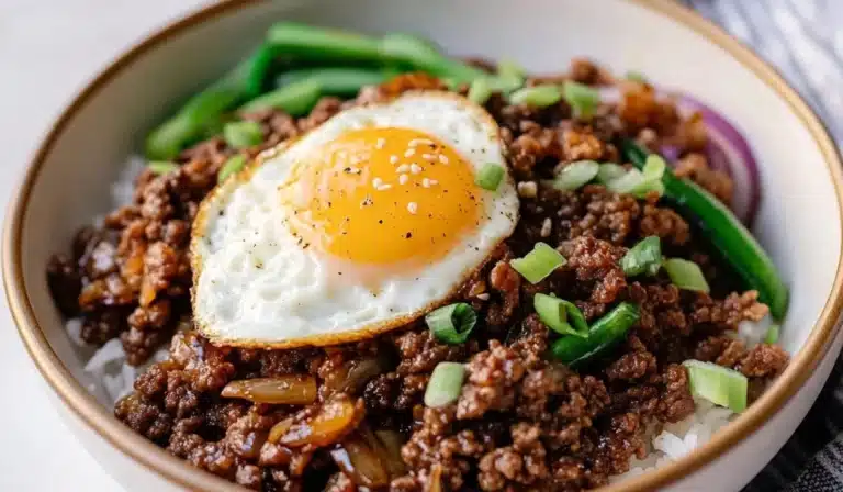 - Fried egg – Essential: A fried egg adds richness, protein, and a beautiful visual element to the bowl. The runny yolk adds a creamy sauce that coats the rice and beef.