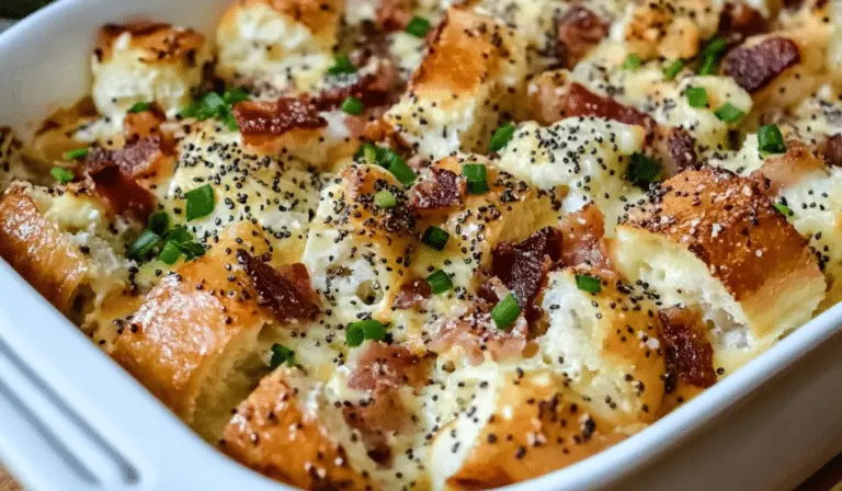 The Everything Bagel Make-Ahead Breakfast Casserole is the perfect combination of savory breakfast favorites, packed into one warm, gooey, and satisfying dish. Imagine the crispy, salty bacon, the melting cheese, the soft, custardy eggs, and, of course, the familiar, delicious flavors of everything bagels. This casserole takes all the elements you love about breakfast and combines them into a single dish that’s not only indulgent but also convenient to prepare. Whether you’re hosting a brunch, a family get-together, or simply want a hearty breakfast to start your day, this casserole will definitely become your new go-to.
