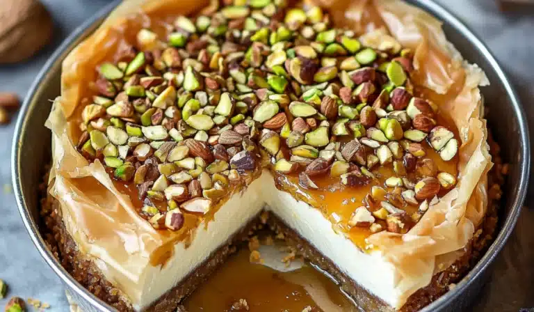 If you’ve ever experienced the delight of biting into a warm piece of baklava, you know just how amazing it can be. The crunchy phyllo dough, sweet syrup, and spiced nuts combine in perfect harmony, leaving you craving more. Now, imagine taking those mouthwatering flavors and transforming them into a rich, creamy cheesecake. That’s exactly what this Honey Pistachio Baklava Cheesecake does. It marries the decadent flavors of baklava with the smooth, luscious texture of cheesecake, resulting in a dessert that’s guaranteed to impress anyone who tries it. Whether you’re a beginner or a seasoned baker, this recipe is perfect for anyone looking to try something new and exciting. The best part? It’s simpler than it looks, making it ideal for beginner cooks who are just starting to build their baking skills. By the end of this recipe, you’ll have created a showstopper dessert that blends two classic favorites: cheesecake and baklava. What makes this cheesecake so special is its combination of textures. The crisp, flaky phyllo pastry at the bottom gives a buttery crunch that pairs perfectly with the creamy, tangy cheesecake filling. The nutty layer of walnuts and almonds, combined with the honey topping and pistachios, creates a rich and satisfying contrast that will leave your taste buds dancing. This cheesecake is not only delicious, but it also brings a bit of elegance to your dessert table. It’s a unique twist on a traditional dessert that combines both simplicity and sophistication.