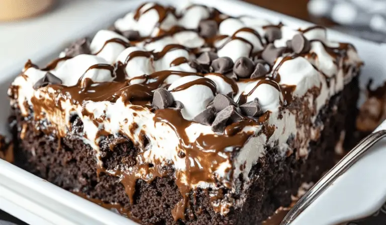 Poke cakes, in general, are beloved for their versatility and ease of preparation. The concept of poking holes in a freshly baked cake and filling them with a flavorful liquid or filling allows for a moist, flavorful cake that’s perfect for both casual and formal occasions. This Marshmallow Chocolate Poke Cake is a twist on the classic poke cake, infusing it with layers of chocolate ganache, marshmallow cream, and extra chocolate swirls. The result is a showstopper dessert that will leave your guests—and your taste buds—impressed.
