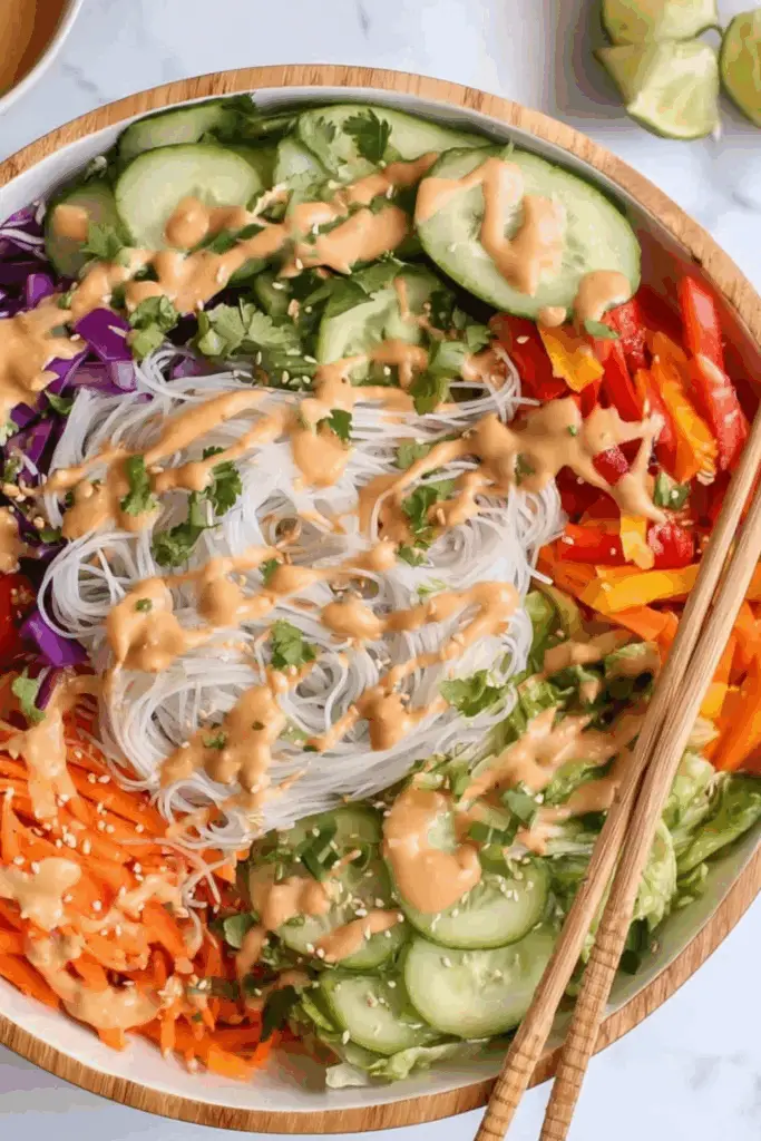 This Spring Roll Salad with Peanut Sauce is a crunchy, vibrant, and satisfying meal made with rice noodles, crisp vegetables, and a creamy, savory peanut dressing. Perfect for quick lunches or light dinners, and easily customizable with your favorite proteins.