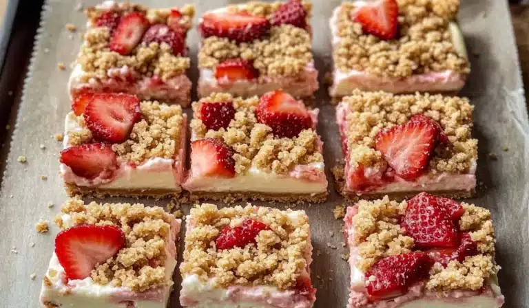 Dessert lovers, rejoice! If you’ve ever wanted to create something that looks and tastes like it came from a bakery but doesn’t require a lot of effort, then these Strawberry Cheesecake Bars are the answer. Picture this: a buttery graham cracker crust, smooth and creamy cheesecake filling, topped with fresh, juicy strawberries, and finished off with a perfectly golden, crumbly topping. Sounds irresistible, right? That’s exactly what you’ll get with this easy, beginner-friendly recipe. What’s even better is that it requires only a few simple ingredients, which means no complicated steps and no stress. If you’re new to baking or simply want to make something that’s impressive yet easy, these bars are for you.