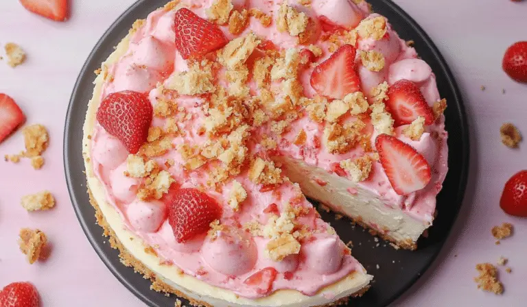 This Strawberry Crunch Cheesecake is the perfect dessert for any occasion, combining the rich creaminess of cheesecake with the sweet, fruity flavors of strawberry and the satisfying crunch of cookie crumbs. Its simple yet delightful ingredients come together to create a dessert that is as fun to make as it is to eat. Whether you’re serving it for a summer gathering or simply treating yourself to a sweet indulgence, this cheesecake will bring smiles to everyone’s face. So, gather your ingredients, follow these easy steps, and enjoy a slice of nostalgia with every bite!
