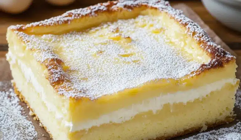 Experience a melt-in-your-mouth Vanilla Magic Custard Cake with three distinct layers: a dense base, creamy custard center, and light, airy top.